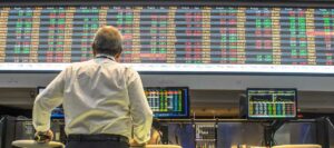 un broker de pie y de espaldas, observa datos del mercado en la pantalla del parquet de bolsa